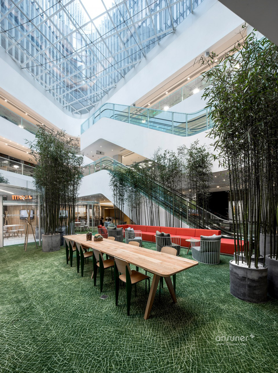另外一个中庭则选择了“公园会议室”的设计概念,以清新竹节和透明玻璃为主要材质营造出靠近大自然的私密会晤空间。这个共享空间以“人本主义”最合理的方式平衡了专业高效工作和乐享休闲时光的这个生命主题。更为匠心独运的是3Q办公间的共享模式“打通”了一条行业社交和创意分享的通道,构建了一个资源共享、行业互通的交流平台。在这里,也许一杯咖啡的时间,你可以了解一个行业最新的资讯和脉动!