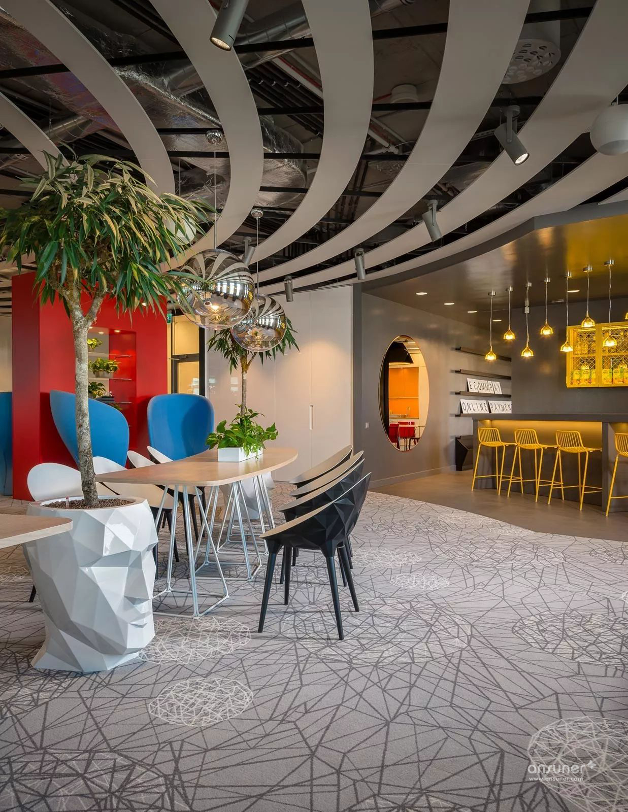 设计工作室Katz最近在拉脱维亚首都为ECommPay(国际支付服务)设计一个新的办公空间。开放式办公室占地2500平方米,包括休闲区,健身区和各部门工作区。设计师在局部增加了一些吸引人的个性设计和大胆的色彩运用,营造时尚有活力的创意空间。