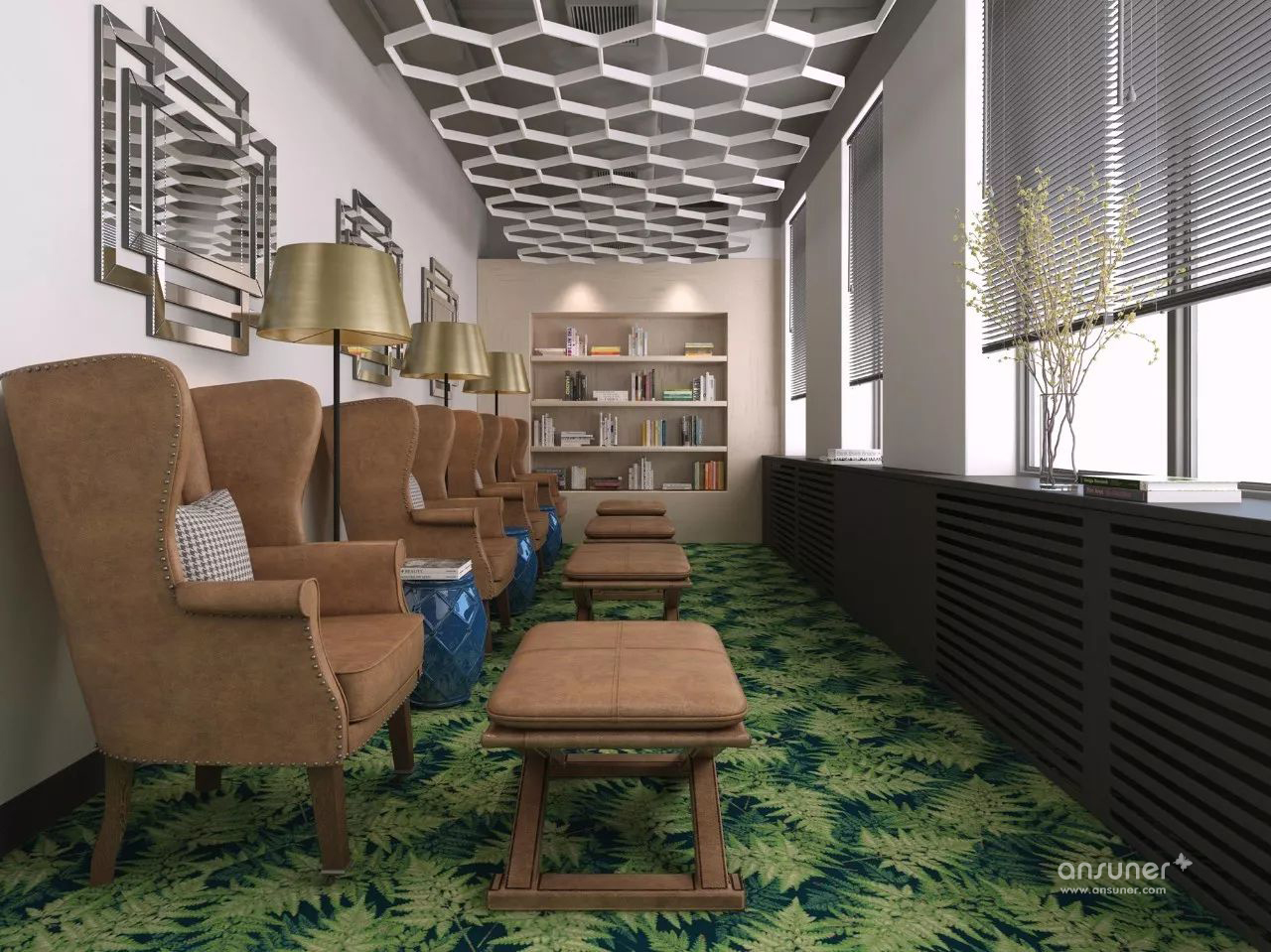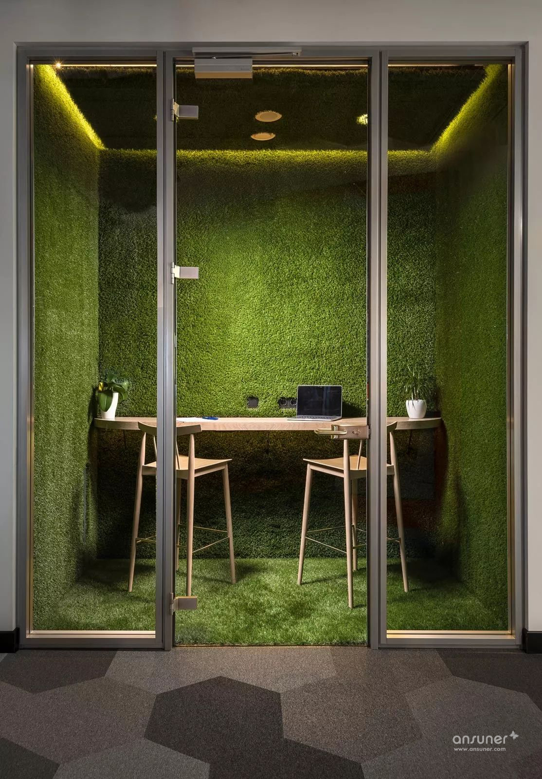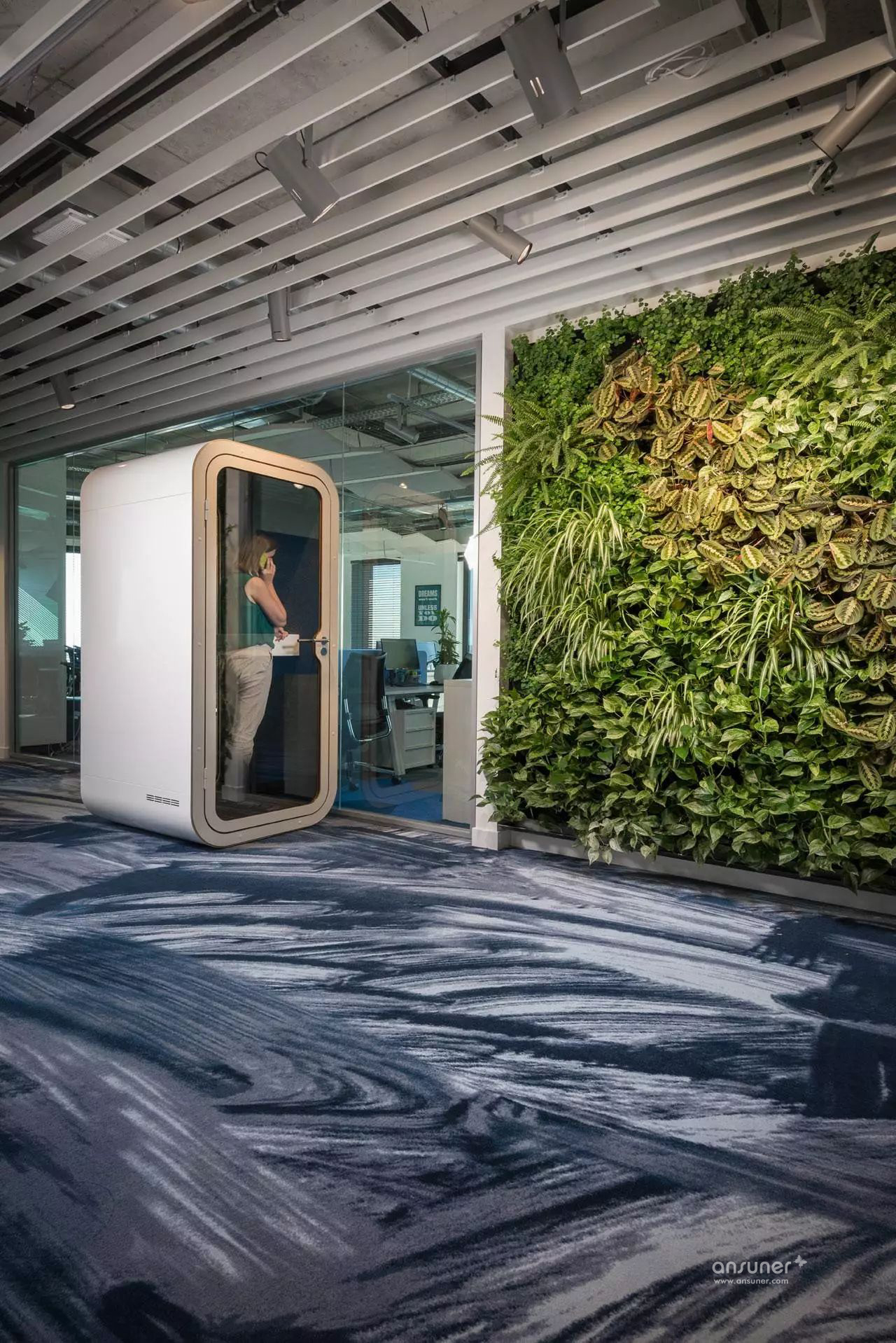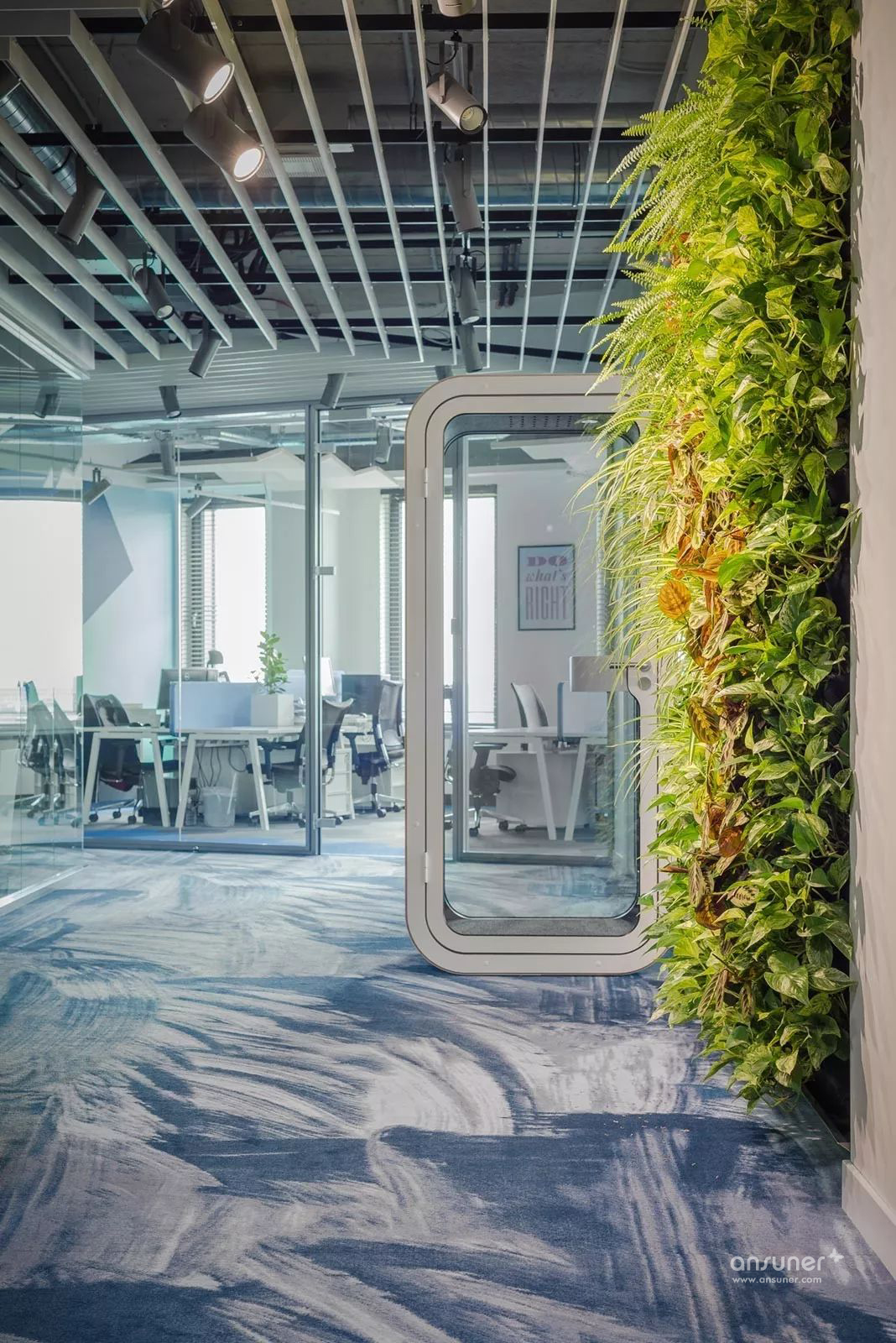 在整个办公室中,设计师添加了大量的绿色植物,一些自然元素和其他的装饰品,其中一些植物组成了个性的主题墙。