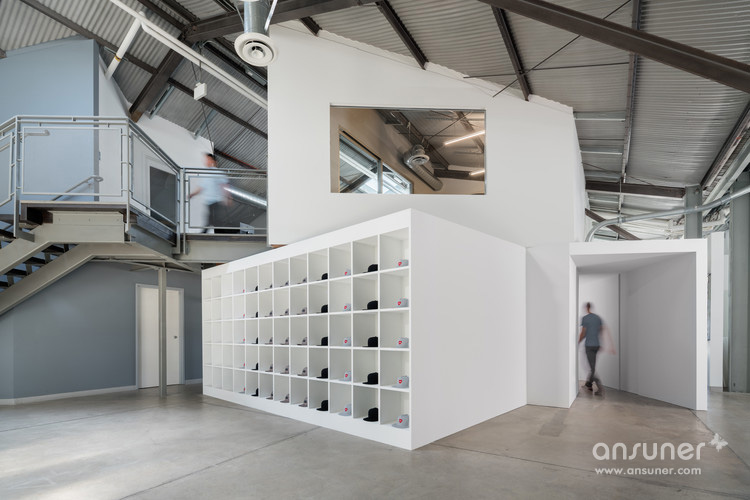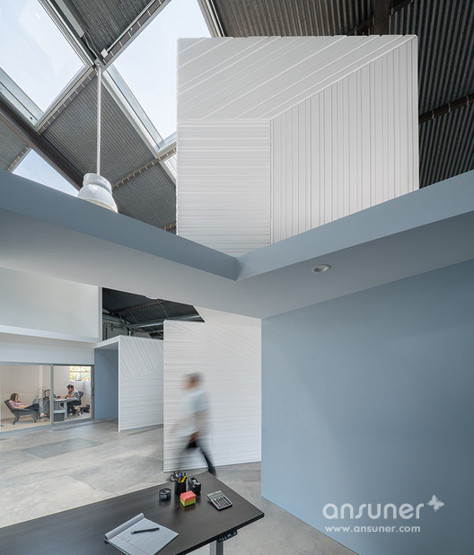 FreelandBuck最近完成了在洛杉矶的Hungry Man Productions总部设计。当被要求重新考虑办公室的组织时,设计师将员工的身份的轻松与一系列颠倒的隔间相匹配 ,这些隔间有趣地挑战了典型的办公空间的规律性。整个大型开放式办公区松散组织,非正式的安排创造了多样化的稳定和灵活的工作配置。此外,设计上充分利用 了仓库外壳的天花板高度,将箱体堆积起来,使视觉上突显和投影区域。在用cnc研磨的MDF的表面处理和涂上细节的表面处理这些翻滚的立方体。从特定的角度来看 ,这些铰接的表面创造了空间错觉和活跃、动态的工作氛围。