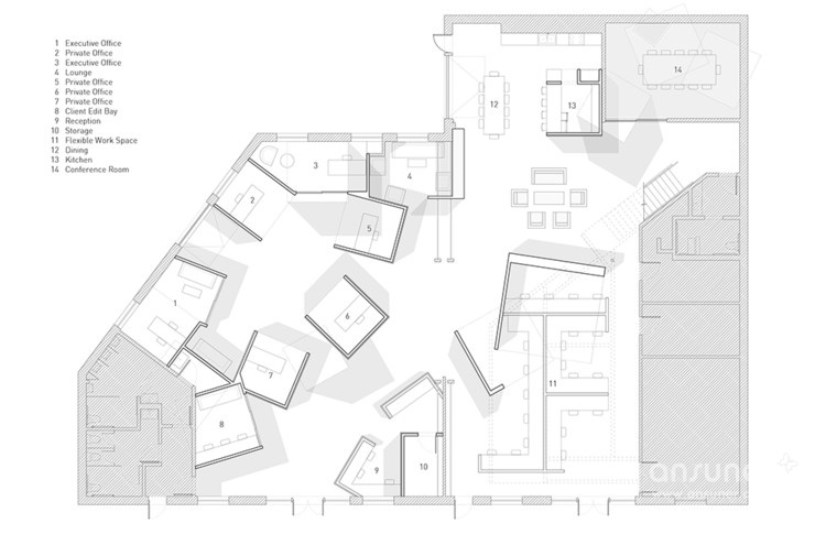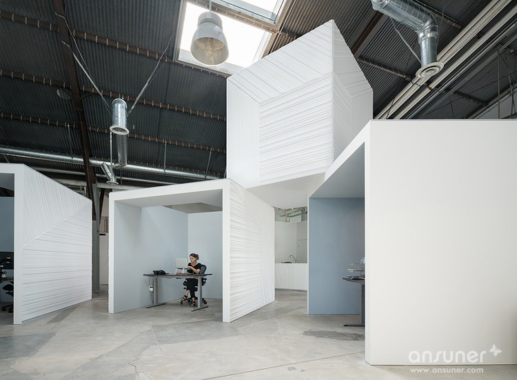 FreelandBuck最近完成了在洛杉矶的Hungry Man Productions总部设计。当被要求重新考虑办公室的组织时,设计师将员工的身份的轻松与一系列颠倒的隔间相匹配,这些隔间有趣地挑战了典型的办公空间的规律性。整个大型开放式办公区松散组织,非正式的安排创造了多样化的稳定和灵活的工作配置。此外,设计上充分利用了仓库外壳的天花板高度,将箱体堆积起来,使视觉上突显和投影区域。在用cnc研磨的MDF的表面处理和涂上细节的表面处理这些翻滚的立方体。从特定的角度来看,这些铰接的表面创造了空间错觉和活跃、动态的工作氛围。