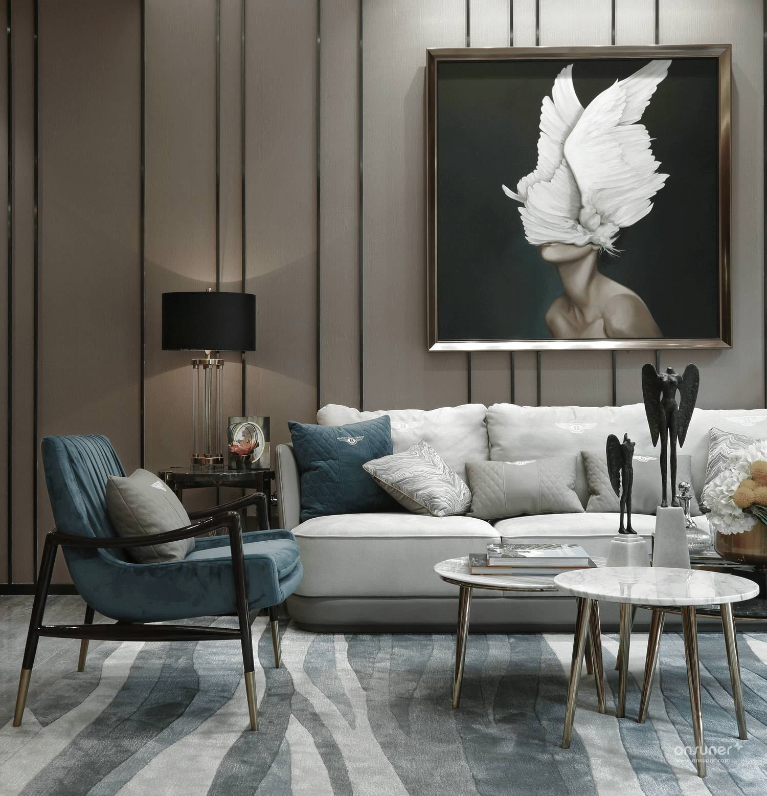 客厅《守望天使》的当代画作,超现实主义的梦幻与先锋画派的高冷交织出迷离的美,与何多苓画布上仙气飘渺的花儿何其接近:茫然而诗意,传递出城市人普遍共有的精神特征,我们茫然地躬行在人生旅途,所幸头顶有诗意的星空可以仰望。