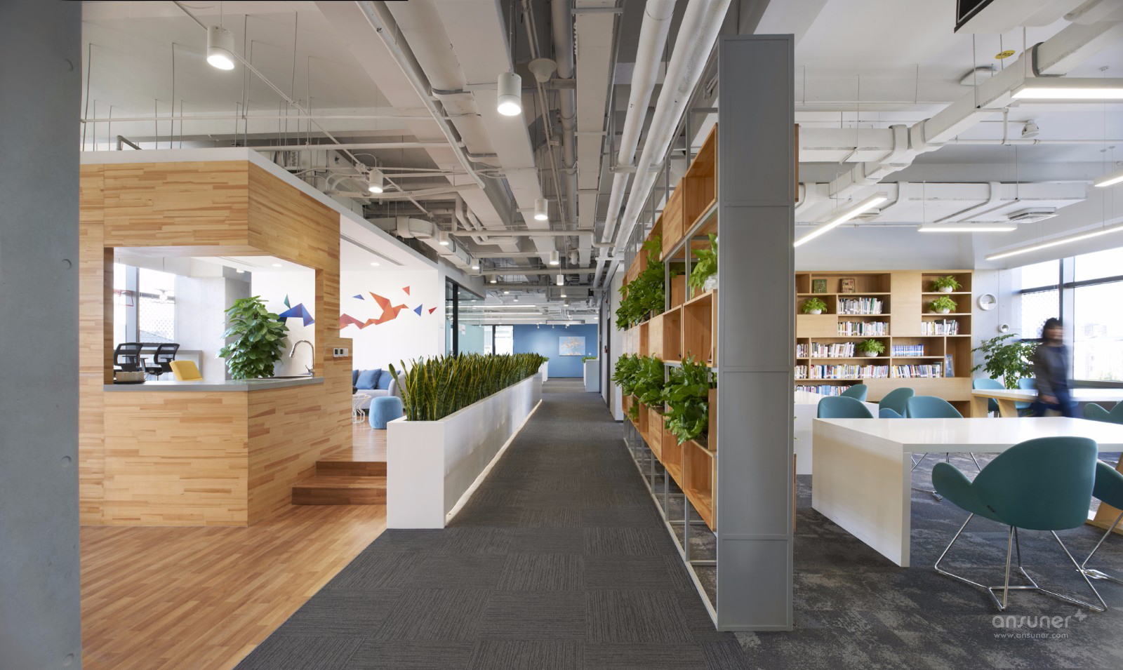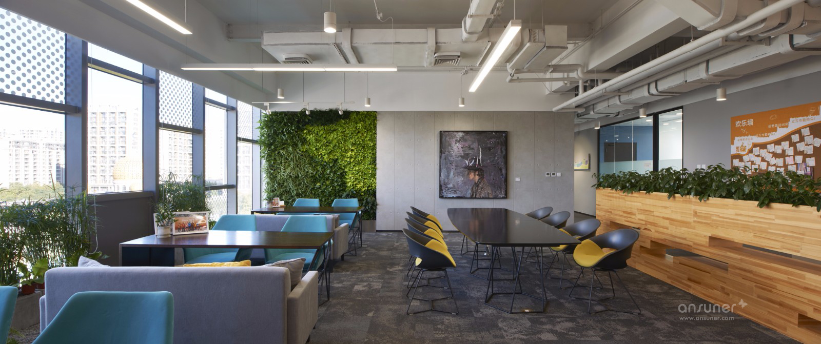 四层和五层的中部分别设置了书吧休闲区和生态氧吧休闲区,这里是办公楼里最令人感到舒适愉悦的空间之一。大面积的原木色和绿植,色彩明快的墙贴和家具,将快节奏的工作氛围阻隔在外,围出一个放缓节奏的小小岛屿。午后时分,充足的自然光洒满整个空间,人们可以随意地从书架上取几本书,倒上杯咖啡,靠在舒适的沙发里,享受一段安静的放松时光。