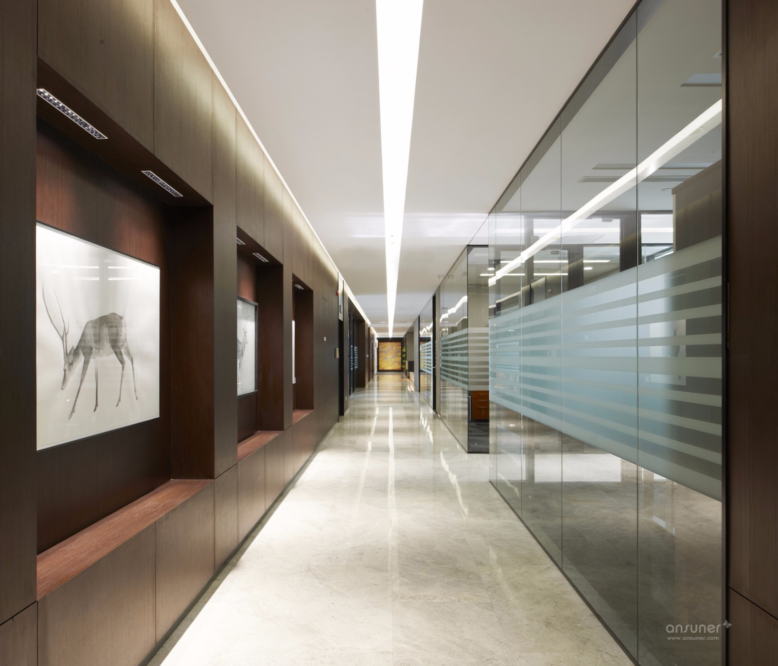 有别于楼下的办公区,位于建筑顶层的高管区多以深木色墙面和家具体现稳重大气、更为私密和严肃的空间特点。