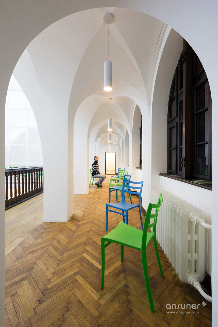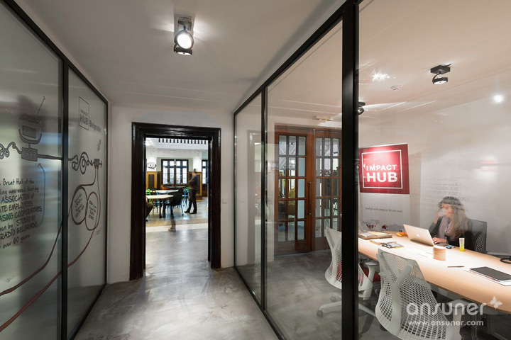灵感的触动对于一个设计师,思考者来讲非常重要,IImpact Hub专业提供独特的系统资源、灵感和合作服务,帮助他们快速成长。教堂形的两层建筑大厅,分成三个双柱廊式拱券通道,并覆盖着大大的拱顶。因为功能需求,重新规划空间组织,一楼包括四间办公室、两间会议室、两个电话亭、厨房和厕所。所有这些功能都围绕中心共享工作空间而设。二层的平台,即可用作工作空间亦可在灿烂的夏日用作社交活动。