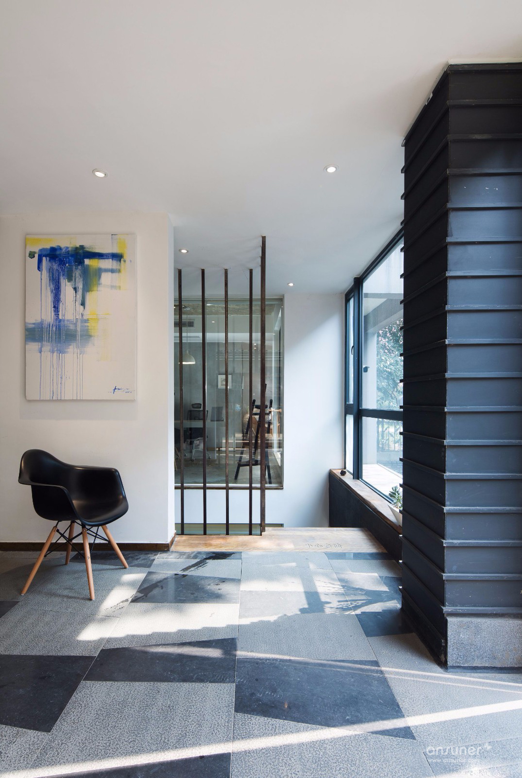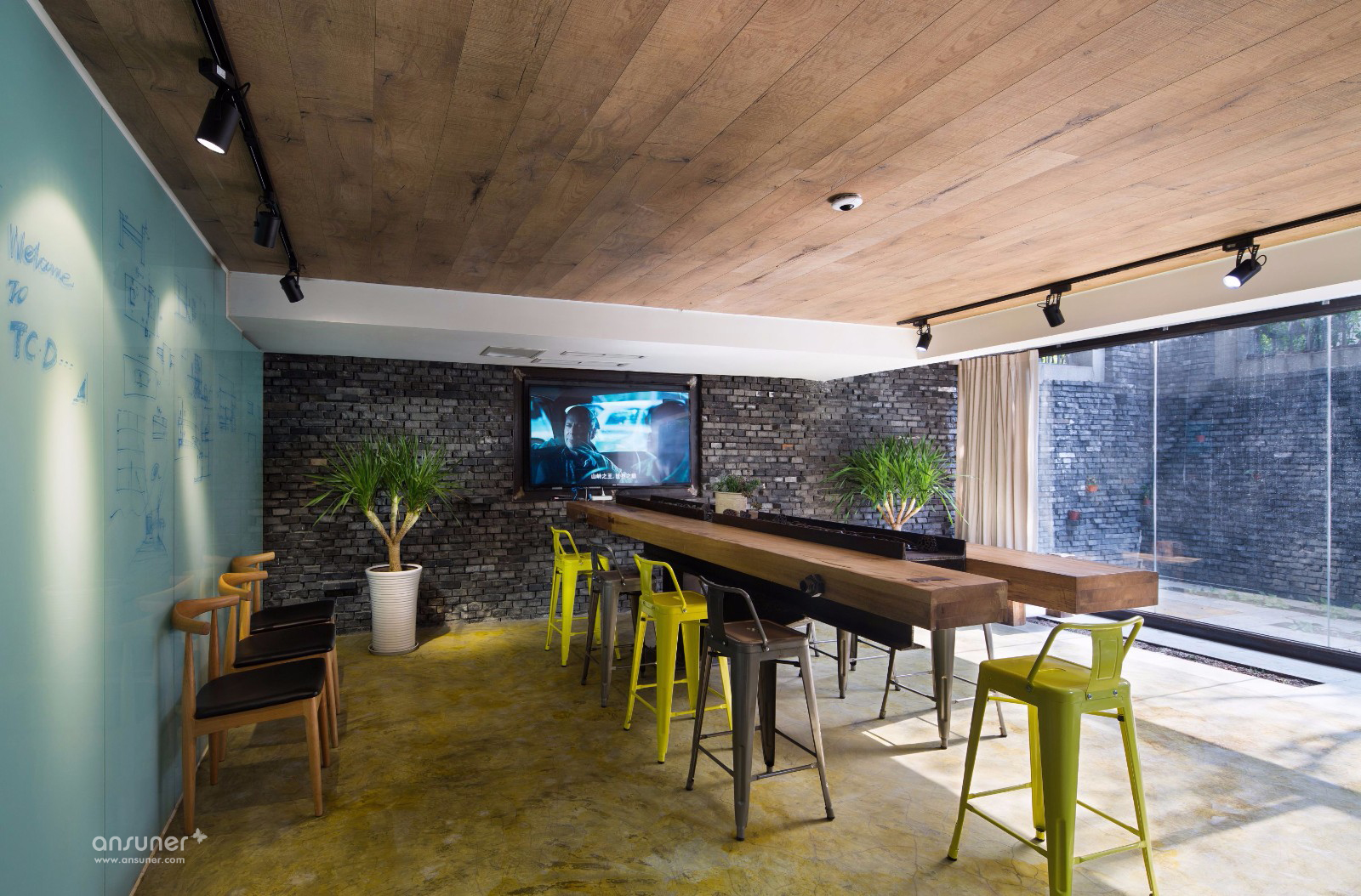 下层是半封闭的庭院空间,从上下互通的围栏到楼梯,皆用裸露的钢结构组成,所有的铁块、钢管都是事先经过太阳暴晒形成锈迹,再加以应用。楼层间是一整面墙,铁质槽口处,种了些许植物,中间的空白处,镂刻出“TCD”三个字母。看似简单干净的旧式厂房里,却涌动着一股清新的气息。下层的空间可以说就是一个家的样子,几张长沙发随意摆放,惬意的茶水区,可供娱乐和休息。困顿倦怠的时候随时可从1楼办公区移步到下层小憩养神。