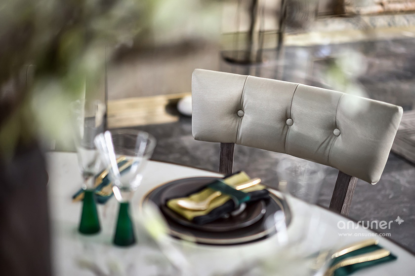 配合着极简的设计构思,餐厅室内空间设计在材质的铺陈和搭配上表达了现代设计的特质,祖母绿的餐具与精致的花艺点缀于餐桌上,使得空间层次分明。