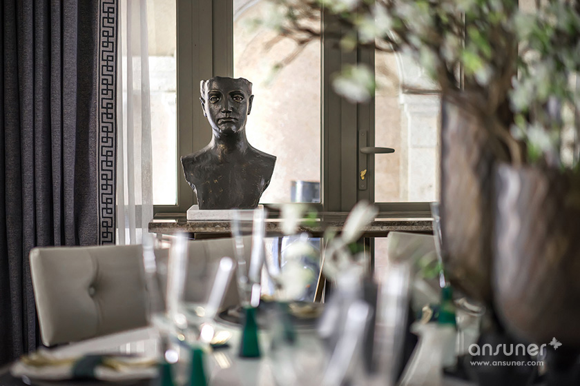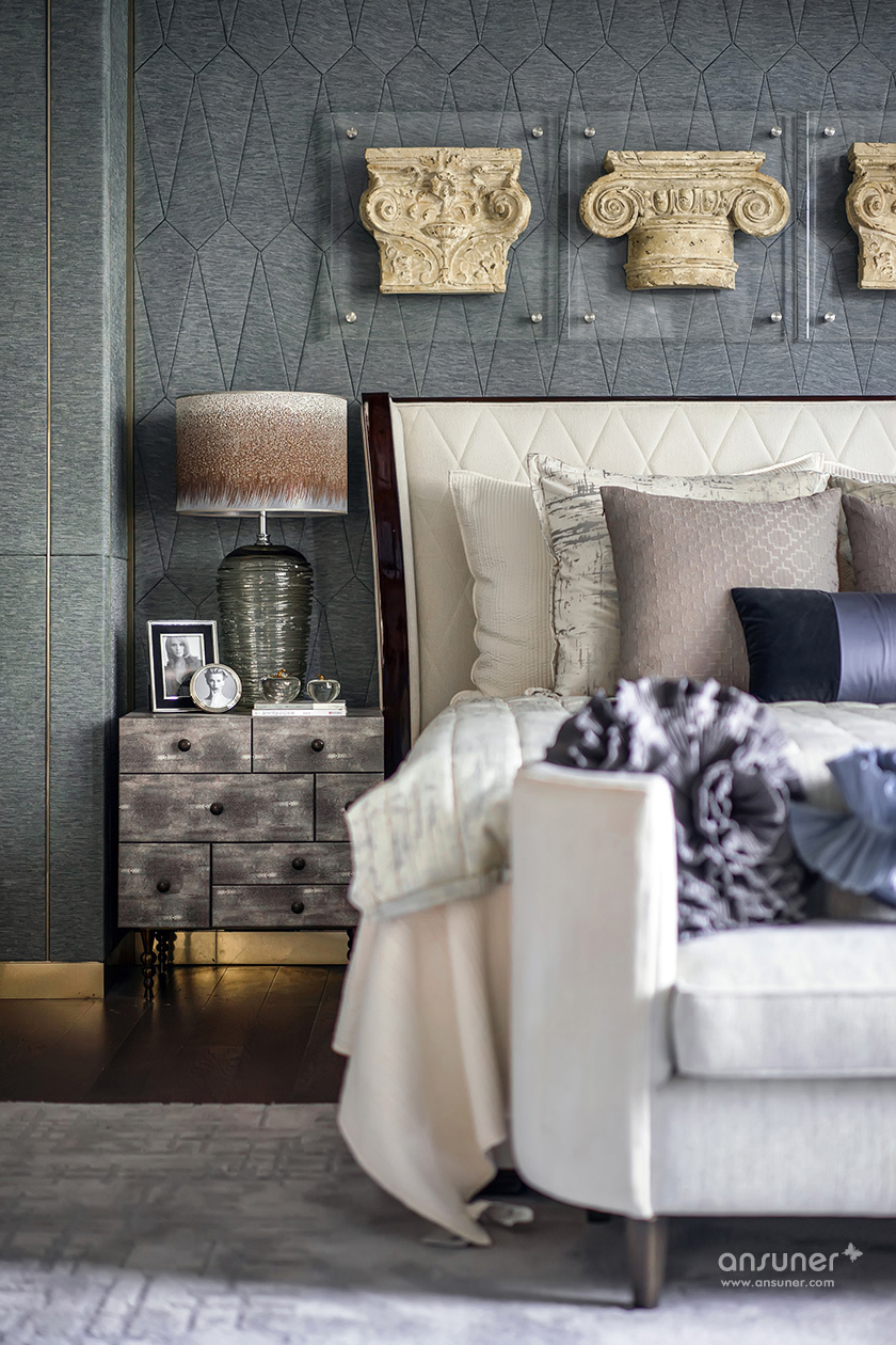 主卧的设计中,设计师将古旧粗犷的古罗马建筑元素提炼成了床头的艺术装置,用精巧的方式将宏大的叙事载入空间,克制的色系与浪漫的表达形成了东方和西方的对话。