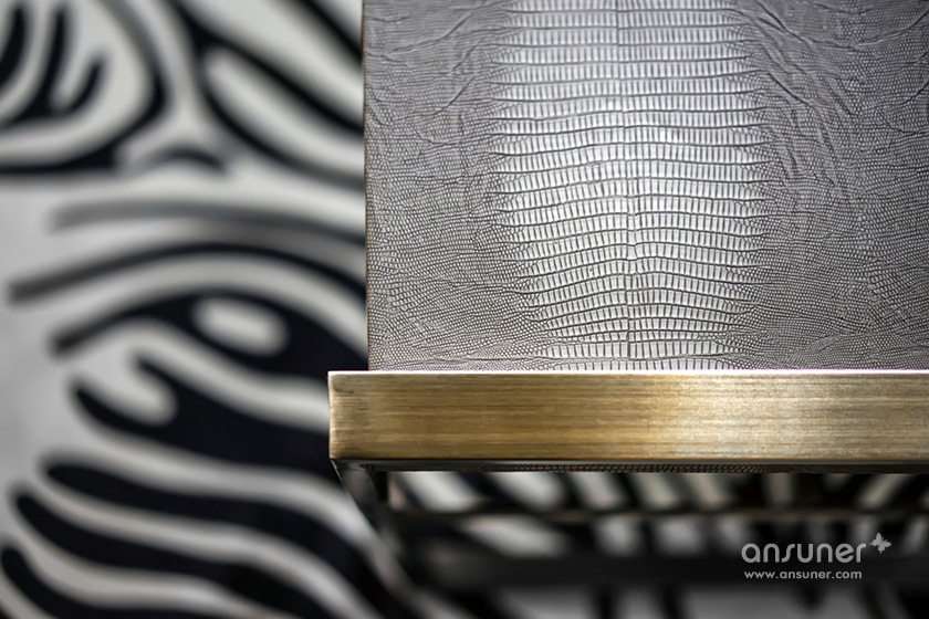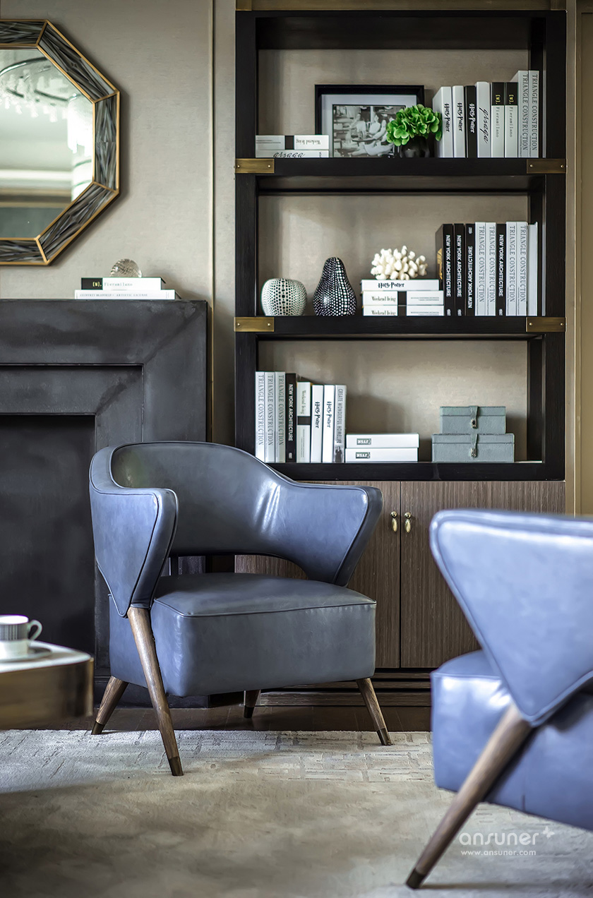书房中,简练的色调,奔放的斑马纹地毯与精致的皮艺形成视觉上的张力,凸显经典与现代的交织感。