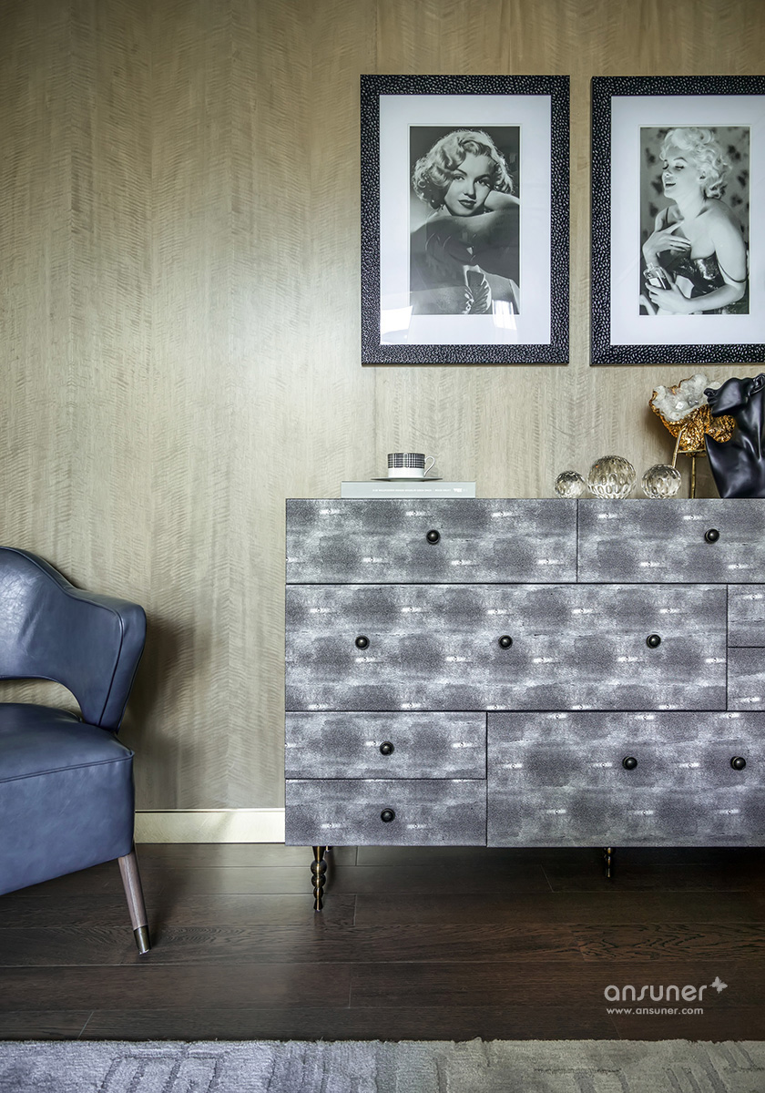 主卧休息室主调为灰色,整体空间庄重内敛,铜质饰品的介入,形成一脉形成的艺术感。