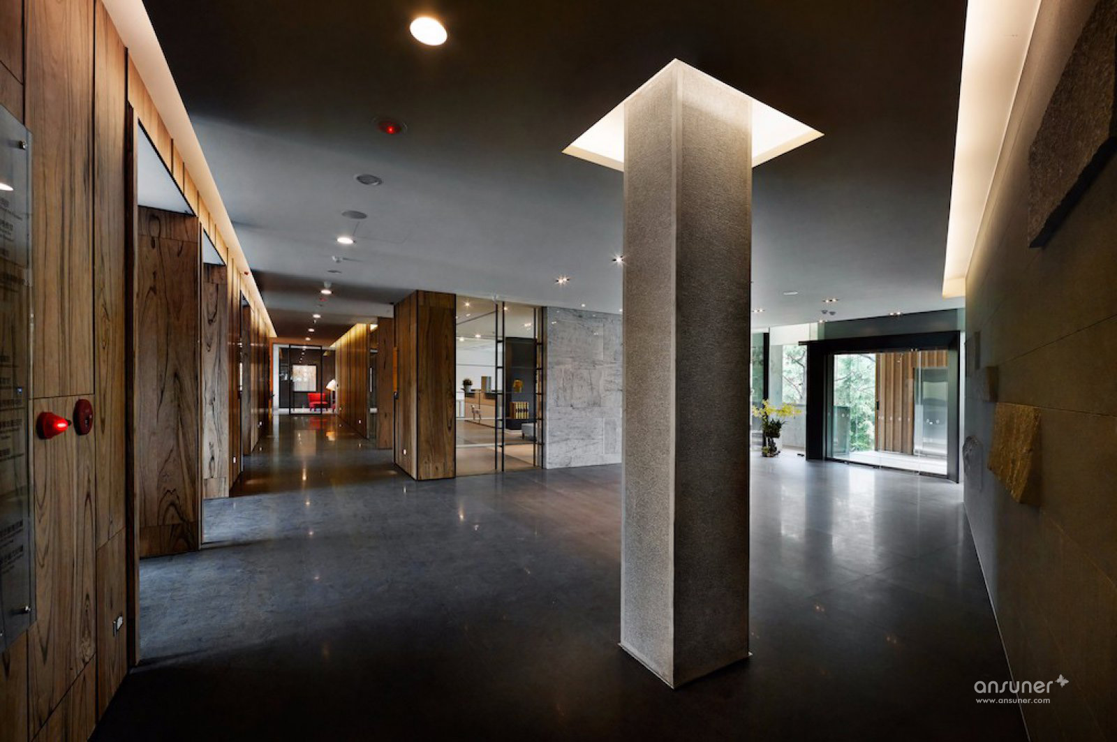 柱顶及长廊墙上的间接灯光溢流而下,柱子与墙的边界消失在天花板内。