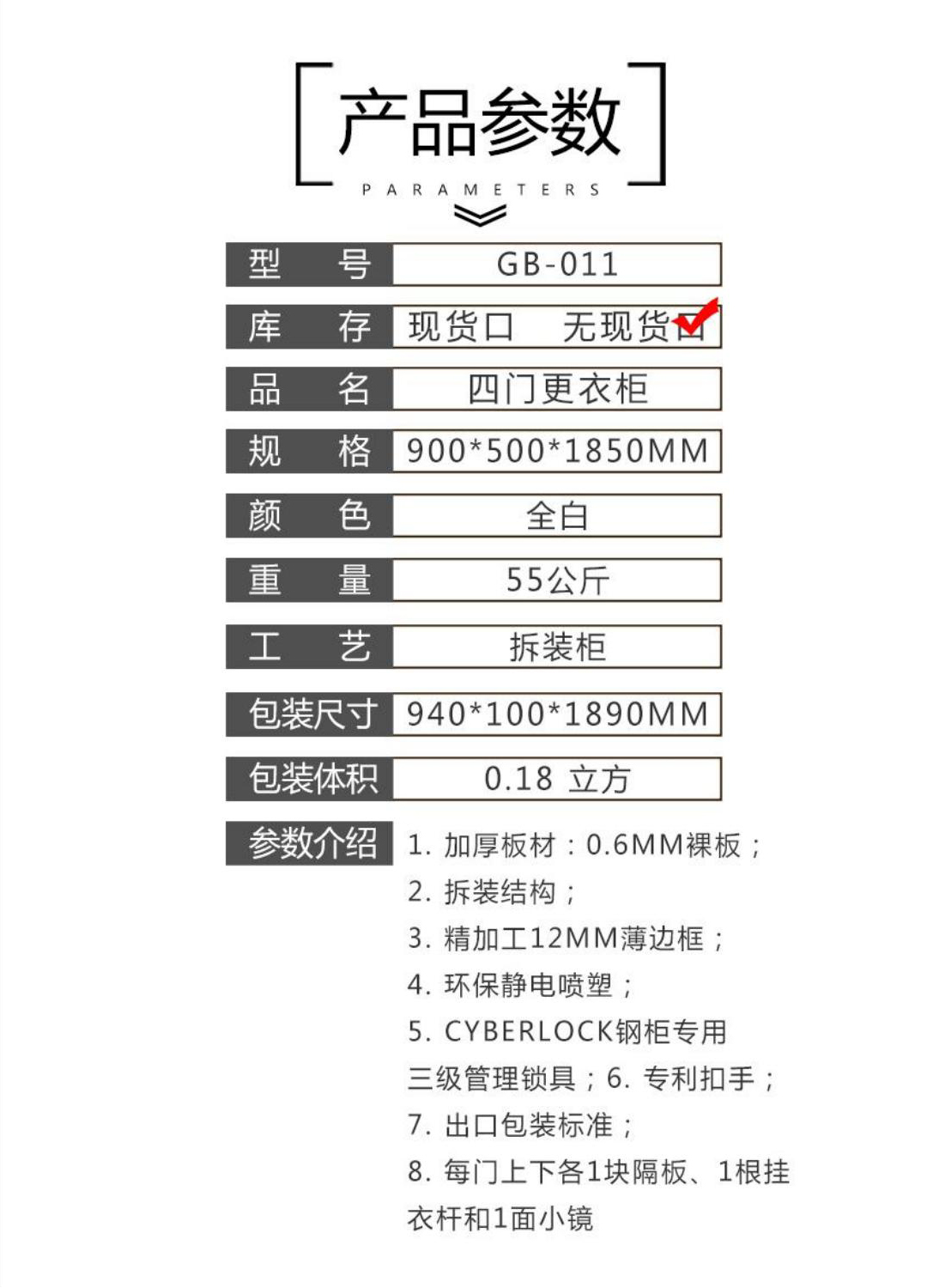 1.加厚板材:0.6MM裸板 2.拆装结构; 3.精加工12MM薄边框; 4.环保静电喷塑: 5.CYBERLOCK钢柜专用三级管理锁具;6.专利扣手; 7.出口包装标准; 8每门上下各1块隔板、1根挂衣杆和1面小镜。