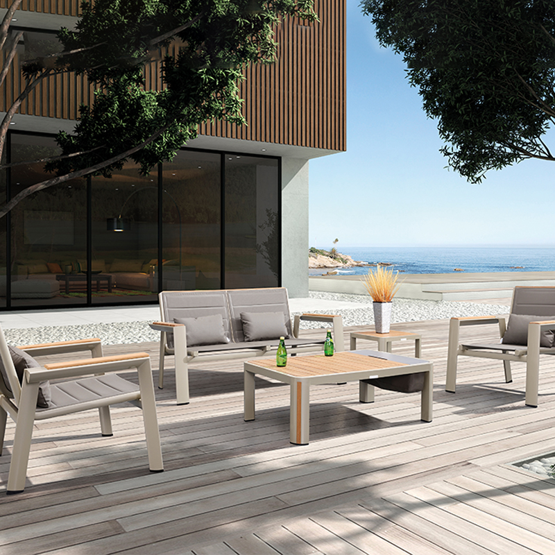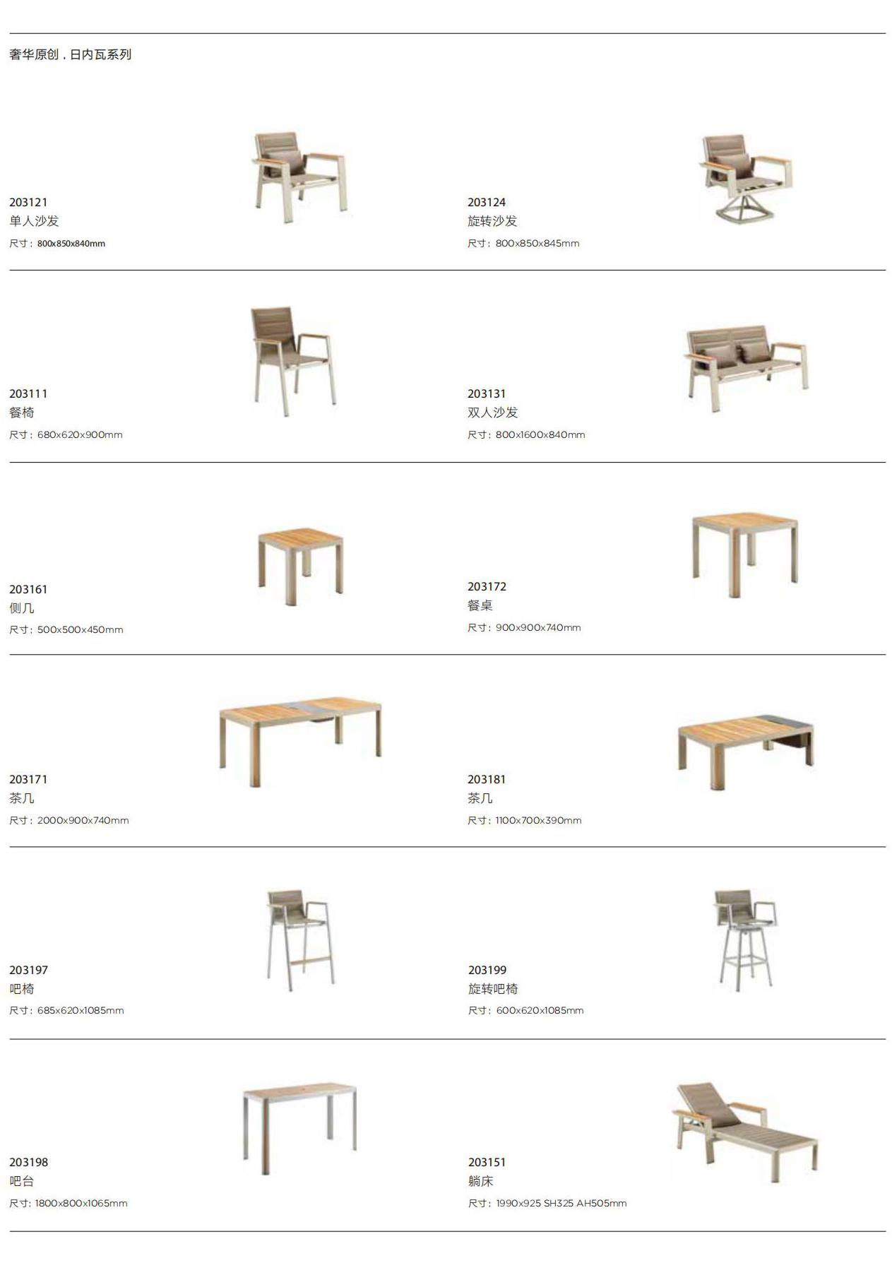 设计灵感:1970年AMC V8 肌肉车,经典中的经典 “经典”---设计灵感是经典中的经典,整体铝镁硅合金外框像极了肌肉车的构造,充满力量; “完美”---横向的热熔缝制处理和竖向的精密线条做点缀,完美结合 “高级”---外框架表面喷涂高级香槟色AkzoNobel牌粉末,坐背体采用双层夹棉原理,令产品立体有充满动感 “多元”---系列产品配套齐全,沙发、餐桌椅、转椅、躺床、高吧餐桌椅、飘床等,满足您的不同生活需求 瑞士手表有极高精准度,而日内瓦系列由此得名。人们一提到户外家具,往往联想到更多的是藤艺的或者是铸铝的款式,如今随着现代设计潮流的繁荣,金属外露的设计也变得愈来愈紧俏。 日内瓦系列的每个产品细节,就像手表一样,都做到了极致,令人无可挑剔。纯天然柚木扶手和桌面,触感真切,随时随地感受大自然。不规则的木板排版,让人耳目一新,记忆犹深。坐背体采用双层夹棉原理,热熔的缝制处理令产品立体又充满动感。 日内瓦系列选用高级香槟色粉末喷制金属主体,灰褐色特斯林面料制作软体结构,当香槟味遇上Taupe色,仿佛陷入纯情,一幕幕经典的爱情故事再次映入眼睑。 日内瓦系列配套有沙发、多人位餐台餐椅、高吧台和吧椅、组合沙发、旋转休闲椅、沙滩躺床及飘床,应有尽有,满足您不同的生活需求。